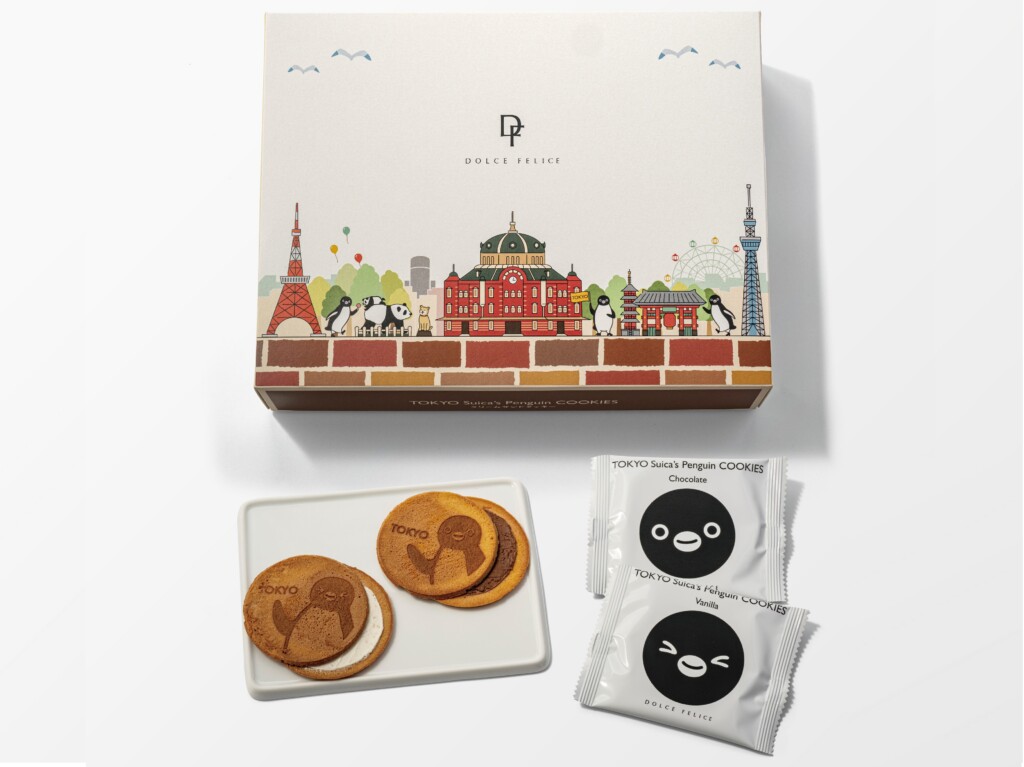 以東京車站為中心,企鵝Suica引導遊客的東京街景為設計靈感的包裝。米粉酥餅夾心著香草和巧克力奶油。
