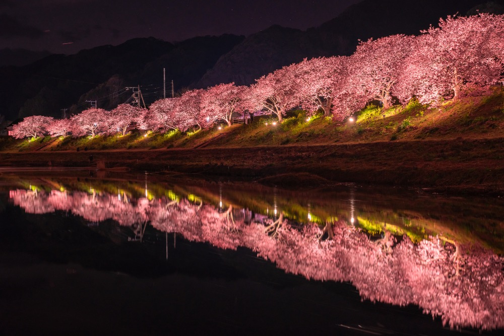 而隨著夜幕降臨,沿著川岸點燃的夜櫻燈光,不僅照亮夜空,還添上星光點點,加上冬末春初的空氣清新怡人,不僅是尋常白天所難以感受到的絕美景致,更是浪漫至極的夜晚,絕對是個讓人陶醉的約會勝地。而夜櫻在河津川上的倒影格外美麗,夜晚照亮的櫻花沿岸更是壯觀動人,絕對值得一遊。