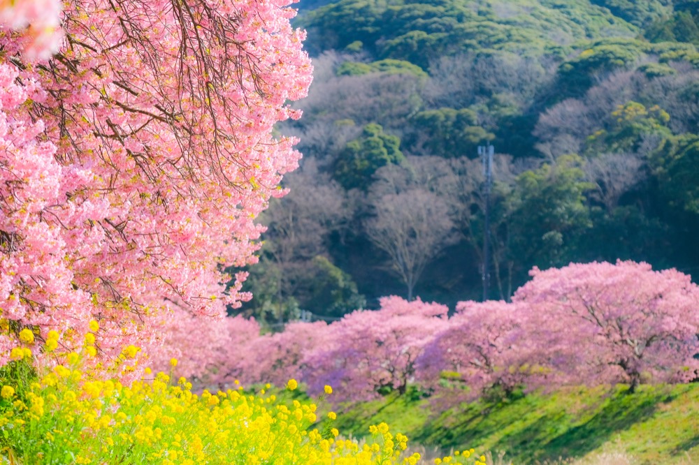 河津櫻花祭被譽為日本最早的賞櫻之旅,由於伊豆溫暖的氣候,河津櫻每年在2月中旬達到滿開,在稍有涼意的2月,能夠欣賞到盛開的櫻花,實屬難得!與此同時,隨著河津櫻的綻放,周圍的金黃油菜花將同步盛開,將整個地區的風景變成色彩繽紛的畫卷,粉紅與暖黃的和諧對比,讓人心曠神怡。