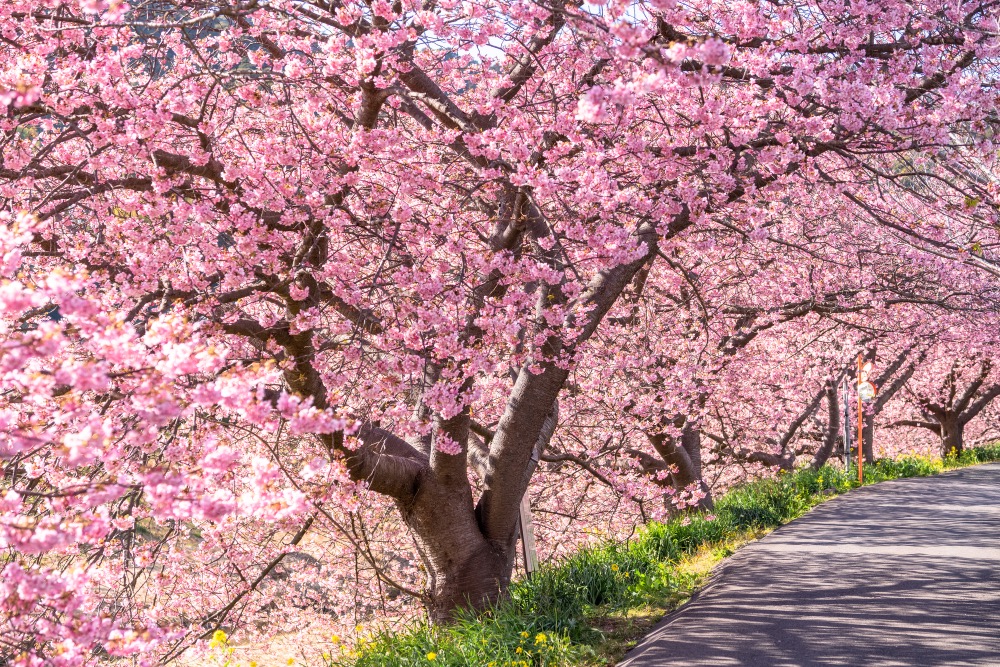 「河津櫻」是一種獨特而迷人的早開櫻花,其原木生長在靜岡縣的河津町,每年春季花開如繁星璀璨,如今已成為伊豆地區的代表性季節風物詩。河津櫻於每年的2月初旬開始綻放,2月中旬達到滿開,至3月上旬逐漸凋謝,濃厚的粉紅花朵比潔白的染井吉野櫻更加艷麗。河津櫻的花期長達1個月,為旅人提供更長的賞花時光,可以盡情沉浸在春季的燦爛之中。
