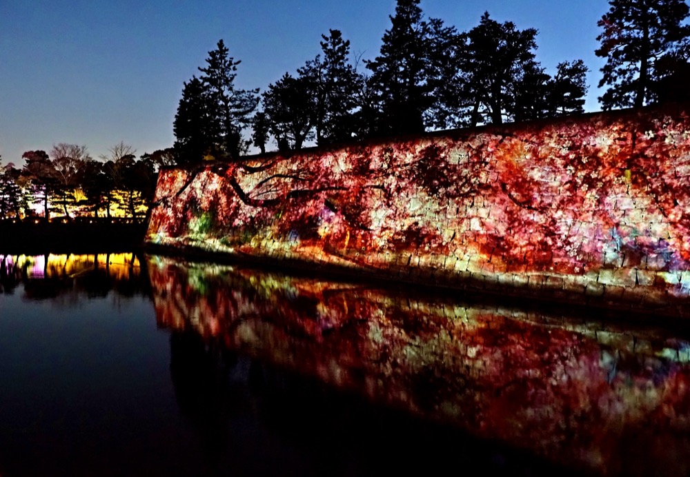 每年春季,二条城綻放約 50 品種、約 300 株櫻花樹,與壯闊的城牆形成絢爛的畫面。尤其在夜晚,城堡被溫柔的燈光照亮,成為夜櫻的仙境。