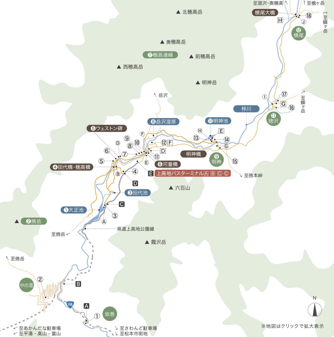 | 從高山出發(岐阜縣) | 搭乘濃飛巴士平湯・新穗高線 至平湯巴士總站(平湯溫泉) 轉乘濃飛巴士上高地線 |