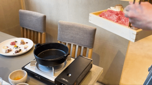 當然重頭戲還是近江牛壽喜燒,烹煮的過程中,現場師傅也會先來協助示範,不需要過於擔心。在這裡可以同時品嚐菲力和沙朗兩種肉質,其油脂的分布也恰到好處,不會太過油膩,沾上蛋汁,滑潤且富有口感。實際吃過江戶牛之後,會更了解其之所以遠近馳名不是沒有原因,一生真的應該品嚐好幾次。