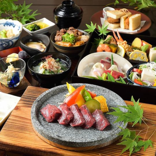 除了可以品嘗到豪華刺身、健康豆腐鍋等,還有「信樂釜鯛魚飯」,以及以日本國產沙朗牛製成的大阪名物「今城燒」!當熱熱的鐵板發出滋滋的聲響,不僅是聽覺的享受,更是視覺與味覺的多重饗宴。