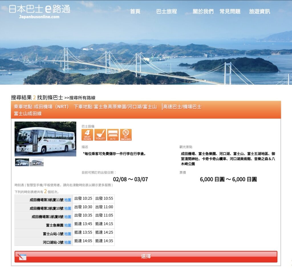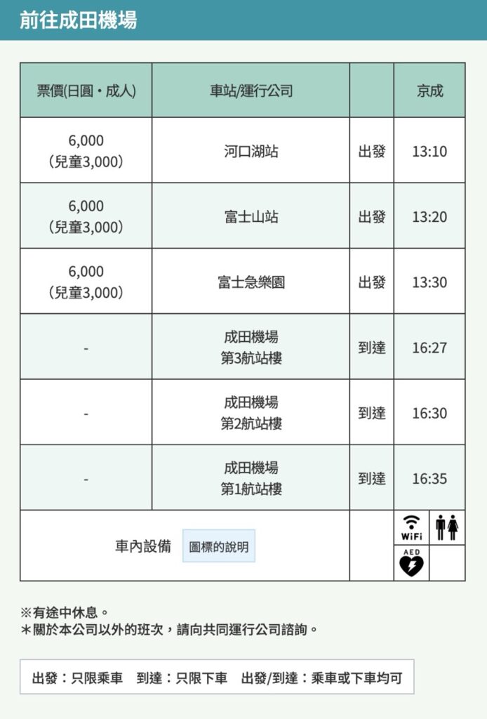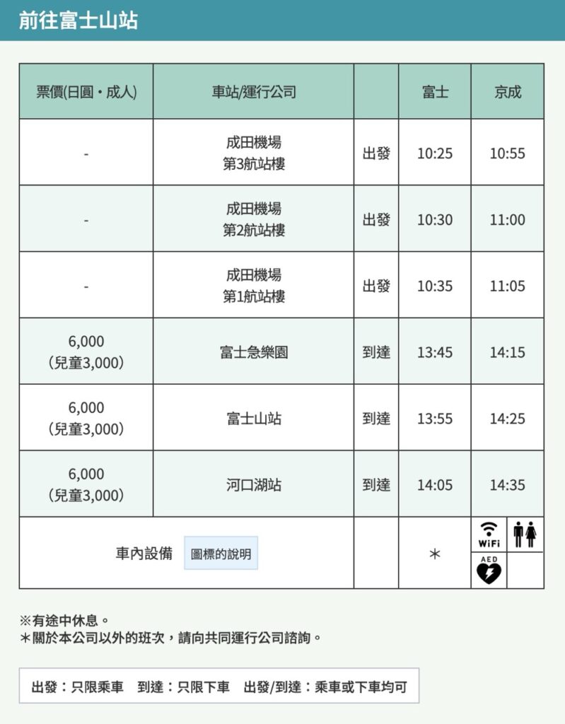 對於搭乘紅眼班機或清晨抵達成田機場的旅客而言,這條直達巴士路線非常方便。每天有兩班車,出發時間大約在早上 10 點多,因此這條路線適合希望直接前往富士山、河口湖地區的旅人。