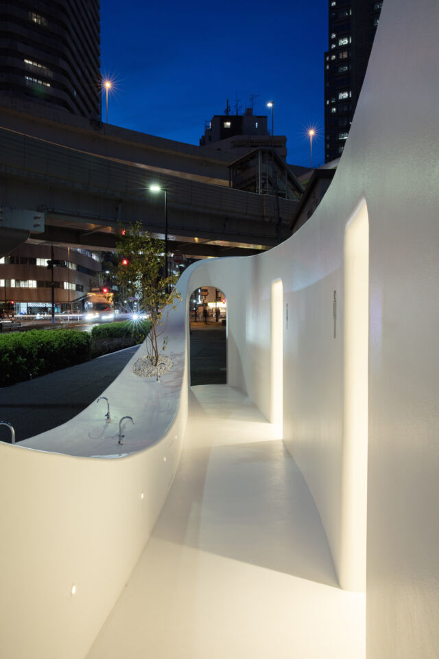 這個廁所的場地位於笹塚的市區中心,緊鄰通勤、上學的車站,是當地商店街,以及幼兒園的散步路線。從孩子到老年人,各個年齡層的人都會經過這條道路。考慮到外圍經常有人通行,設計師將角落設計成圓弧形,並且將屋簷也設計成圓形,讓整個建築更加柔和。