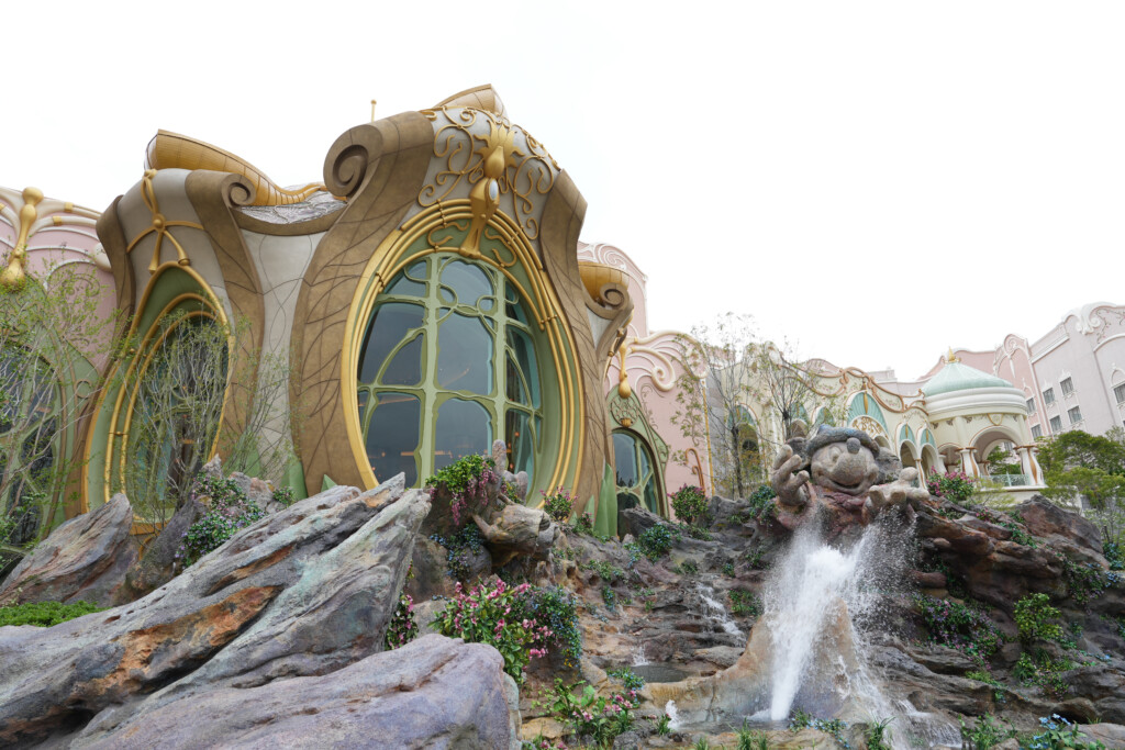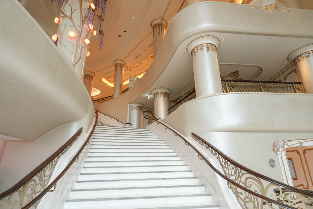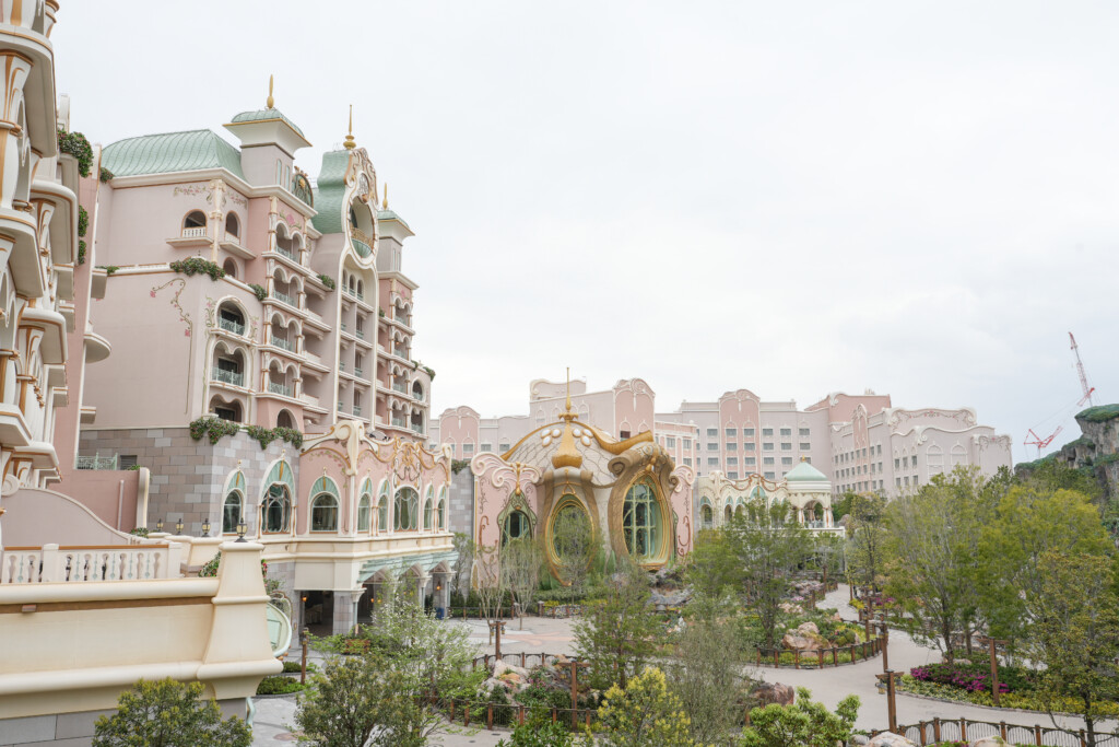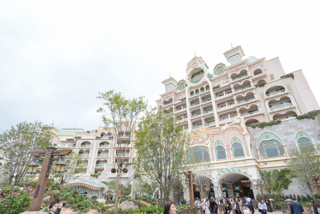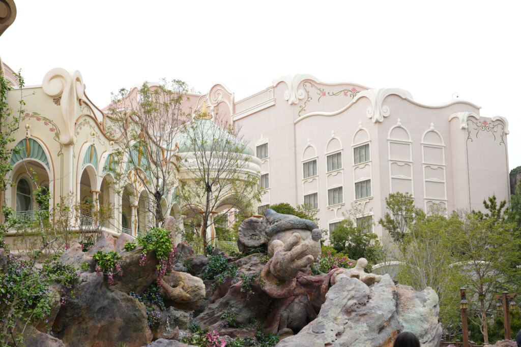 一進入迪士尼飯店內就會被它粉嫩色的外觀吸引,從外觀到庭園的設計,每一處都讓人忍不住細細欣賞。首先,大庭園內可以觀察到有許多與迪士尼人物相關的石雕造景,米奇、小美人魚、美女與野獸等等人氣人物,都能在庭園內找到。有時間的話推薦大家早一點來,慢慢地在庭園與大廳逛逛。