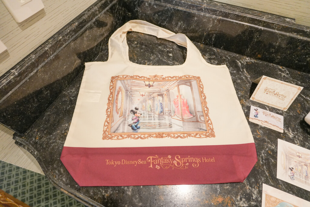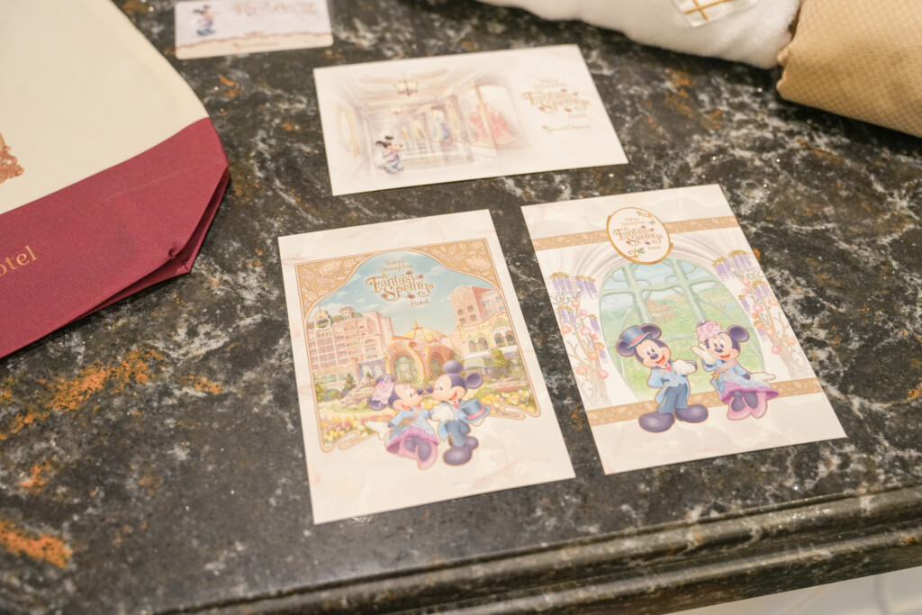迪士尼海洋夢幻泉鄉大飯店真的非常貼心,只要入住飯店,房間內都會準備非常可愛又精緻的環保袋、明信片,可以帶回家做紀念。明信片一個房間內只會放兩套,最多可以跟飯店領取人數份,想要的房客可以和飯店人員申請。而環保袋則是一個房間只有兩個,目前沒有提供額外販售。