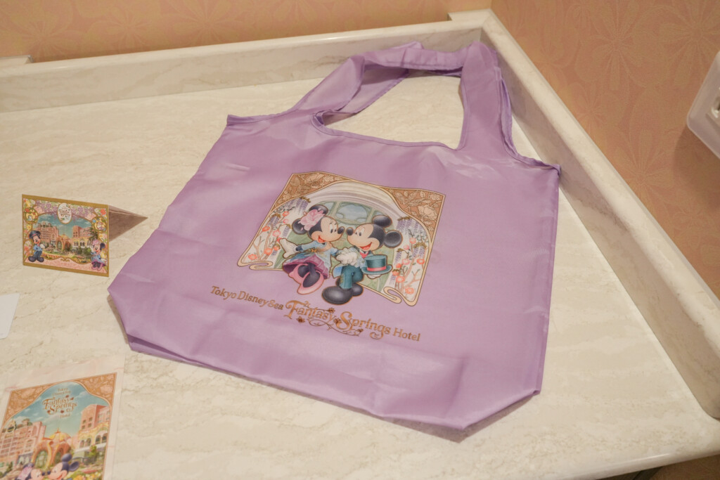 而房間內同樣也有準備非常可愛的環保袋,讓旅客們可以帶回家,夢幻館的設計跟豪華館的不太一樣,以紫色底為主色,搭配可愛的米奇米妮,非常有搜集的紀念價值。