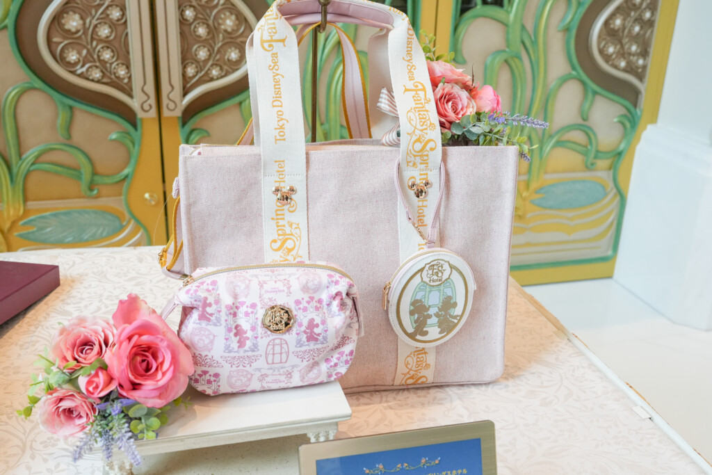這間迪士尼海洋夢幻泉鄉大飯店所準備的限量商品,可說是眾多迪士尼飯店中,讓人感到最可愛的商品。以粉色底的手提包包,搭配上小型化妝包、零錢包,販賣價格為18,000日幣,入住後可以到商店區購買。