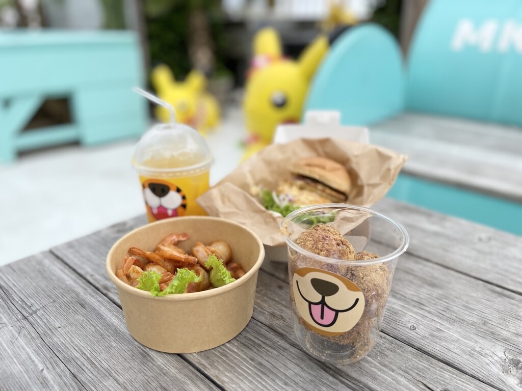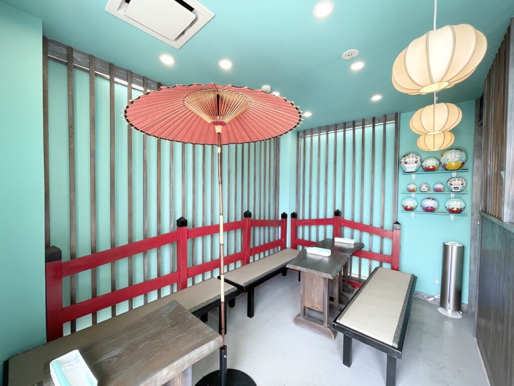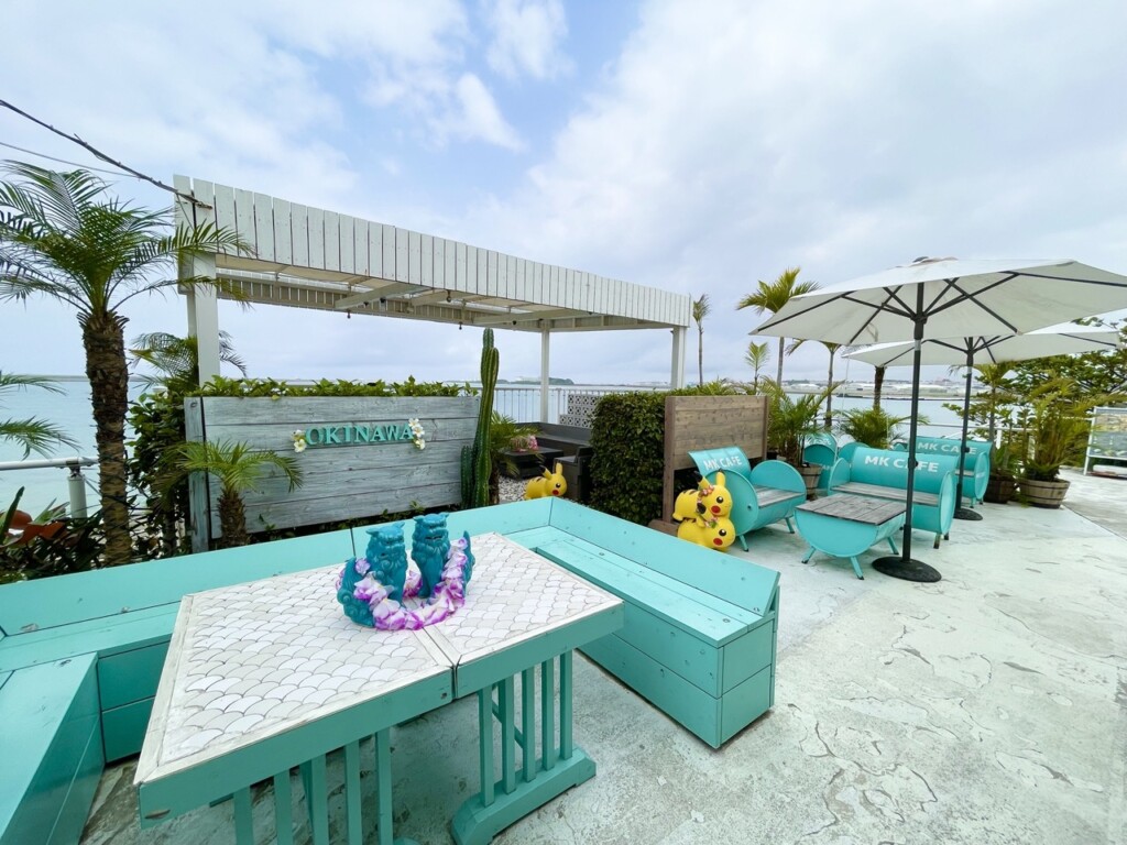 店內擺放著和傘、沖繩名物風獅爺,結合和風與現代時尚的氛圍,無論是在店內用餐,還是坐在露台上欣賞著海的浪漫,都能讓用餐體驗倍添愉悅。值得一提的是,店中除了有超可愛的黃色皮卡丘,還有跟店舖風格一致的薄荷藍色皮卡丘喔!