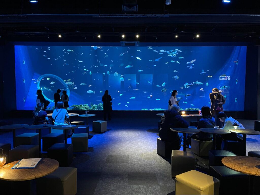水族館內另一個必拍照的打卡點,就是巨型藍色水族箱!水族箱的巨大尺寸和藍色的底色讓整個畫面更加壯麗,色彩鮮豔的熱帶魚和其他海洋生物在水中的優雅姿態,讓人彷彿置身於夢幻的海底世界。