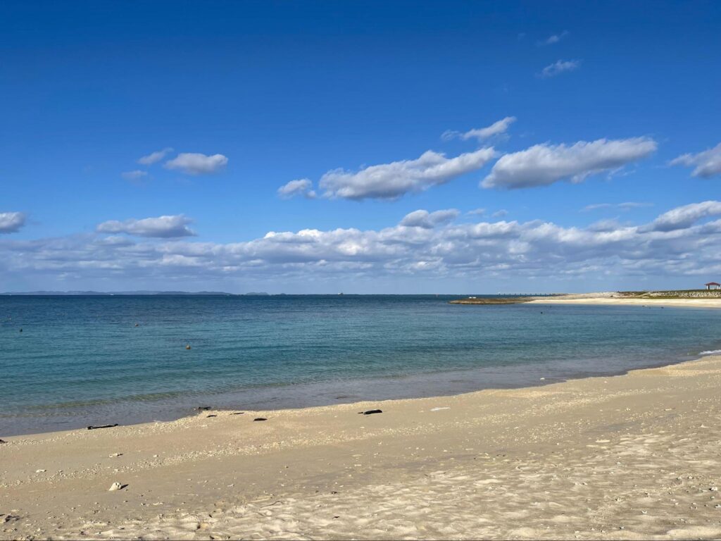 潔白的沙灘延展至遠方,腳下的沙粒在陽光下泛著金光,清澈的海水輕拍著岸邊,偶爾一陣微風拂過,讓人徹底放鬆。