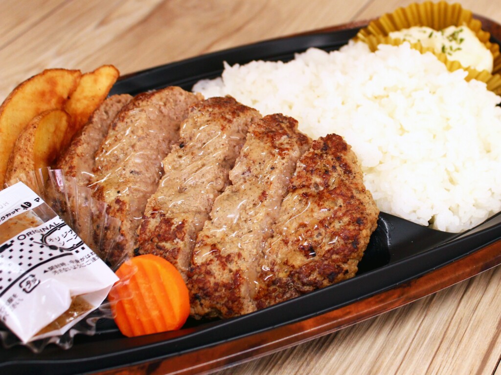 這款便當使用山形縣產的牛肉和豬肉製成的漢堡排,肉質厚實多汁,配上特製鹽醬,滋味更佳。