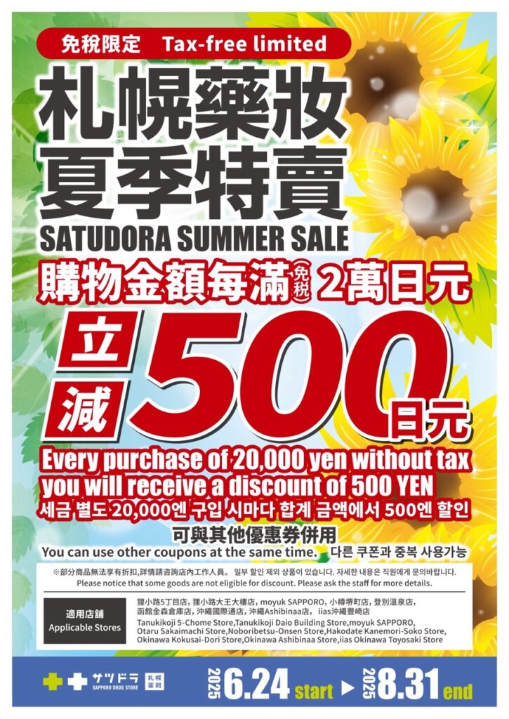 札幌藥妝提供《步步日本》讀者專屬優惠券,只要在結帳時出示優惠券,購物金額每滿20,000日圓(免稅),立刻減價500日圓!可與其他優惠用一起使用!
