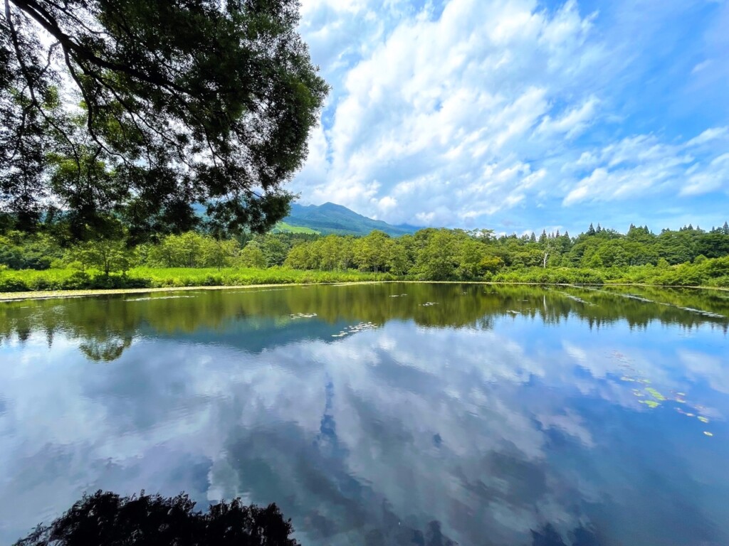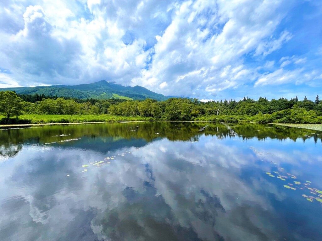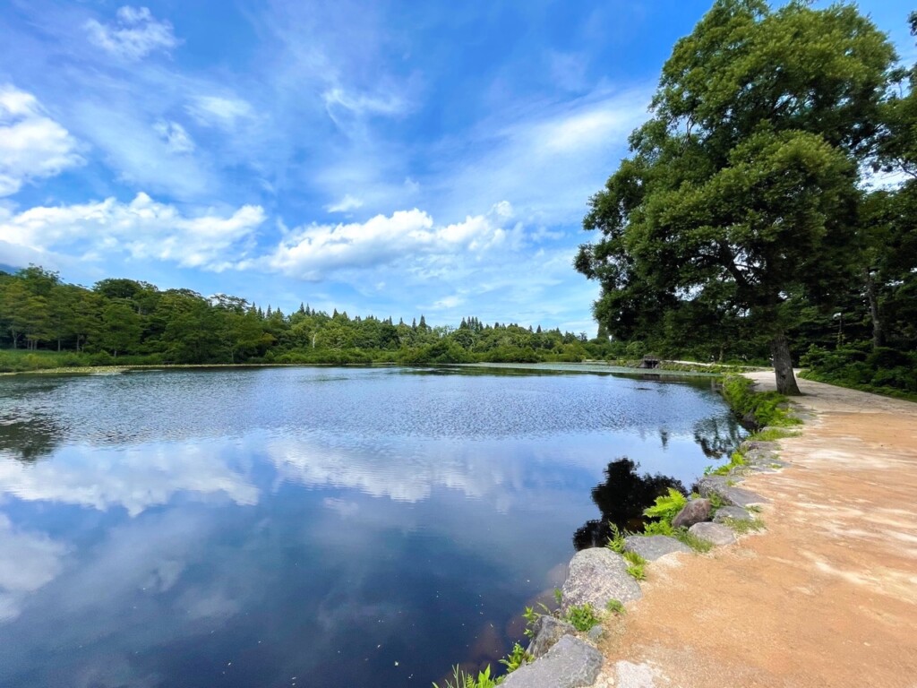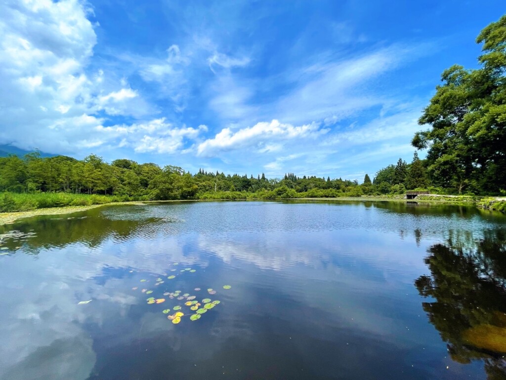 「いもり池」位於妙高高原池之平溫泉的中心地帶,因曾有蠑螈生存而得名。來到公園的那一天,正值炎熱的夏季,晴朗的日子可以在湖面上欣賞到倒映的「妙高山」,這座山可是被譽為「日本百名山」之一。公園內還設有一條環繞池水的遊步道,輕鬆逛一圈只需約 15 分鐘。