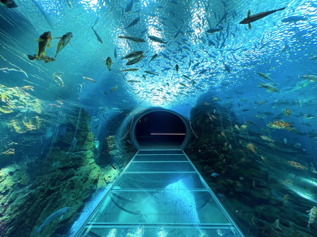 另外,引人注目的亮點之一,就是巨大的水族箱隧道。這個隧道就像是流動的海洋通道,精心模擬海洋環境。漫步在這條通道內,四周透明的全景視角,得以觀賞各種色彩斑斕的魚群,和其他海洋生物自在游水。具有沈浸感的視覺效果,讓人產生置身於深藍海洋之中的錯覺,彷彿與海洋融為一體。