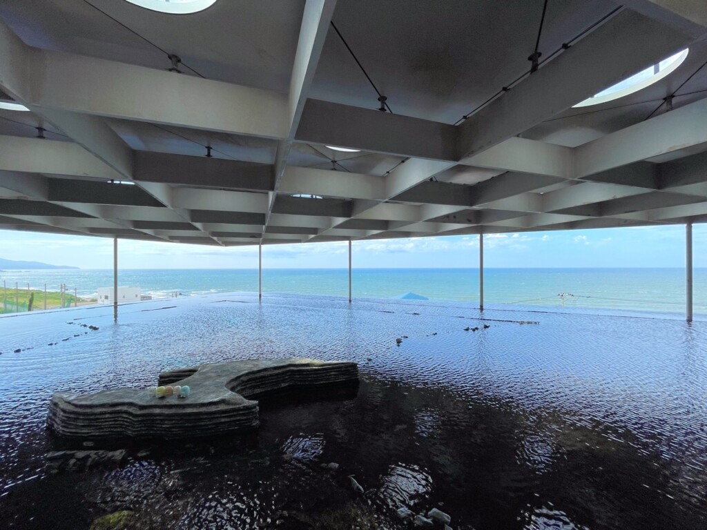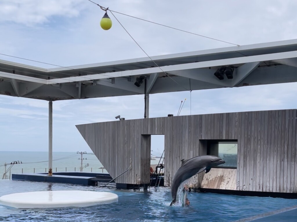 海豚秀旁邊有一個看起來很像溫泉的平台,設計極具巧思。當你站在這裡,眼前的水面靜靜地倒映著湛藍的天空。更令人驚艷的是,遠處的景色就是壯麗的日本海,看著水平面與廣闊無垠的海平面,彷彿這片水域直接與外面的日本海相連。靜謐與壯闊結合的美妙,這樣的視覺感受使這個場域令人難忘。