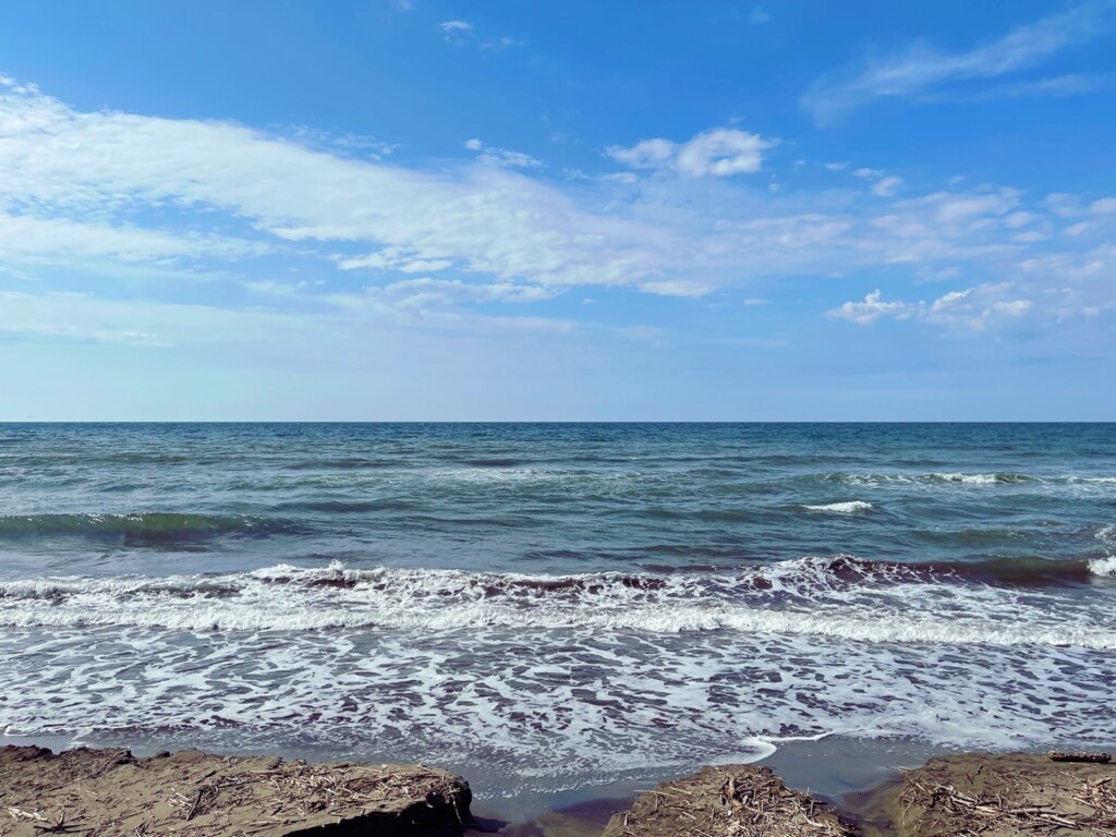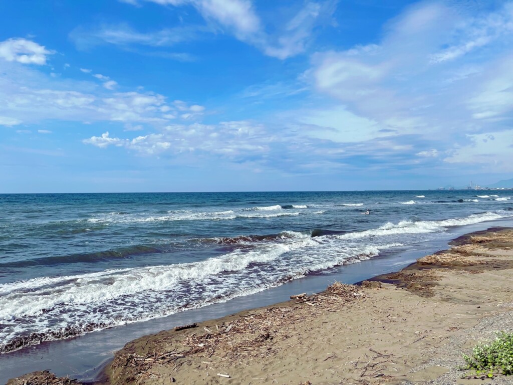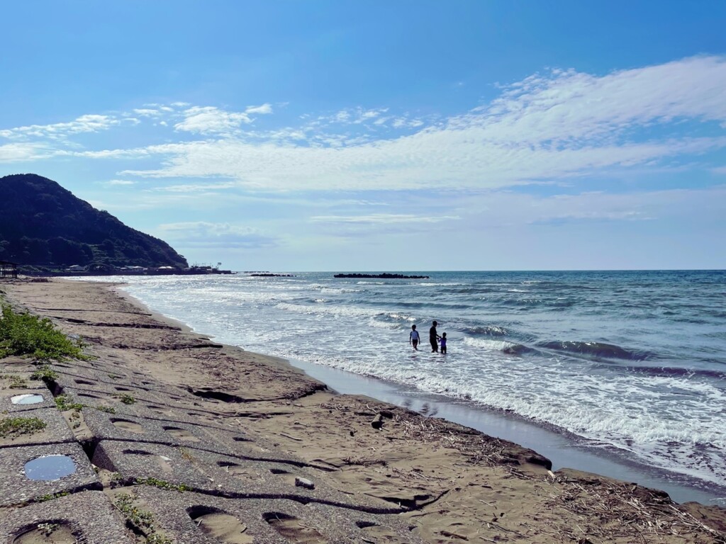 沙灘延展在一望無際的海洋旁,綿延數公里,非常適合游泳和日光浴。當你踏上這片沙灘,會感受到細緻柔軟的沙粒在腳下。水質極佳,因此吸引來自長野縣甚至關東地區的海水浴客。我去的那天,看到家庭在海浪中嬉戲,孩子們在沙灘上築沙堡,笑聲和海浪聲交織著。更令人興奮的是,那天還有不少衝浪愛好者,他們駕馭著衝浪板,迎著海浪在浪尖上飛馳,心情也不禁跟著激動。