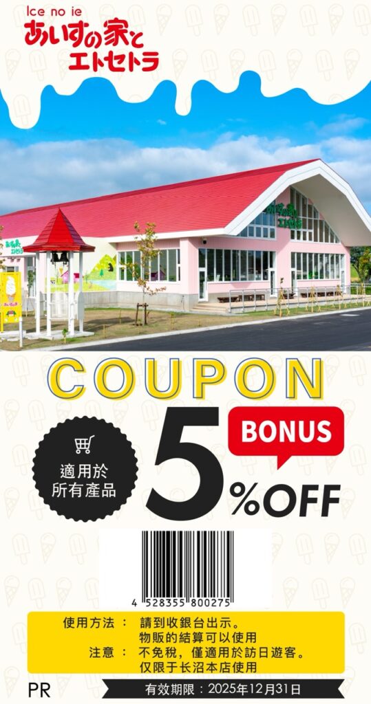 為了讓步步日本的讀者能夠享受這份美味,特別準備了步步日本讀者專屬優惠券!只要在「冰淇淋之家長沼本店」結帳時出示優惠券,即可享有 5% 的折扣!