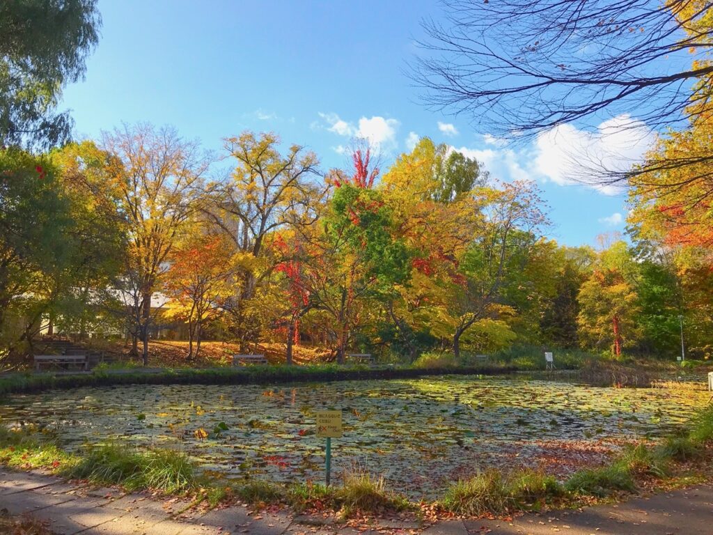 而公園內還有各種品種的楓樹,從深紅到淺黃,層次豐富,讓人目不暇給。我最喜歡的是沿著園內的「菖蒲池」散步,倒映在水中的楓葉美得像一幅畫。