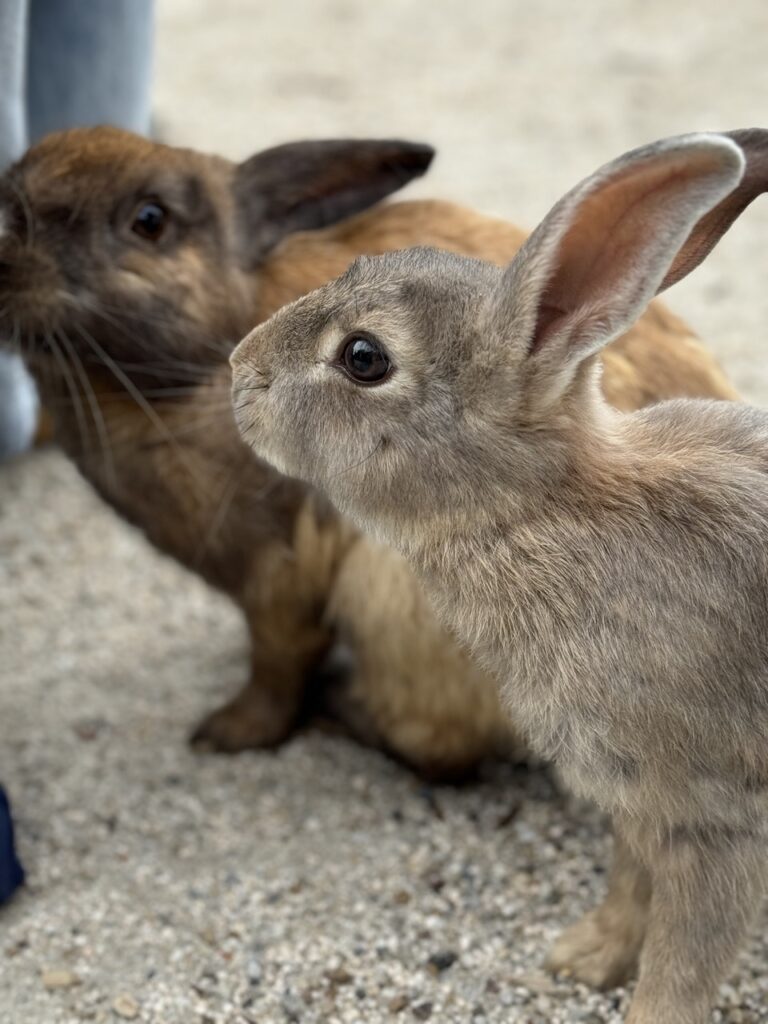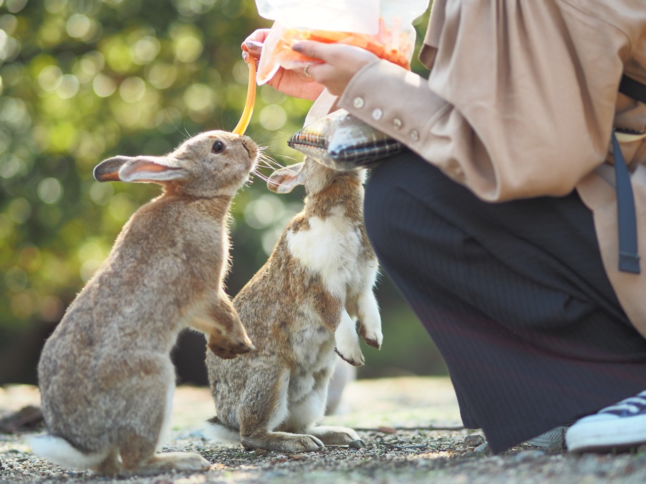 來到大久野島,絕對不能錯過餵兔兔的行程!我們去的時候,有許多日本家庭帶著一大袋蔬菜,例如高麗菜、紅蘿蔔等,應有盡有,要讓毛絨絨的小島民們飽餐一頓。如果像我們一樣兩手空空地來,切記要在搭船前,先在紀念品店買好兔子飼料,島上是沒有販賣兔子飼料的喔!