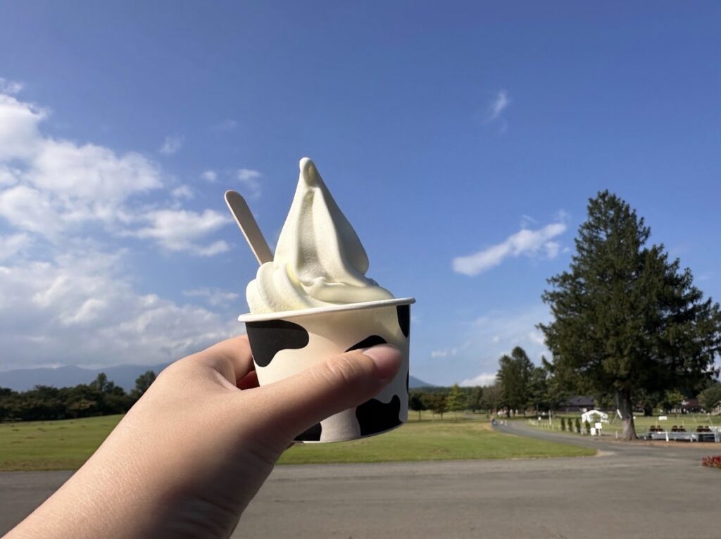 值得推薦的是這裡的牛奶冰淇淋(480日圓),使用小岩井農場生產的牛奶,口感極為濃密香醇,光是咬下第一口,就可以感受到用料的實在。一邊吃著濃郁的冰淇淋,一邊眺望眼前寬廣無比的農場風景,真是心曠神怡啊!