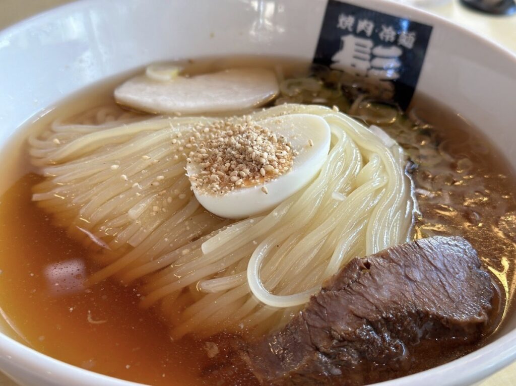 其冷麵特色是麵條皆為手工揉製,Q彈有嚼勁。湯頭使用牛筋湯頭熬煮,清爽順口,讓人忍不住想再來一碗。午餐時段可以選CP值超高的冷麵+燒肉組合,超滿足。