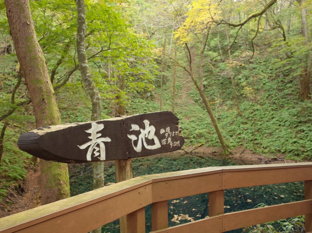 從「雞頭場的池」走約300公尺後,即可到達享負盛名的「青池」。呈現寶藍色的青池讓人驚艷,仔細一看還能看到在湖裡的櫸木枯枝。