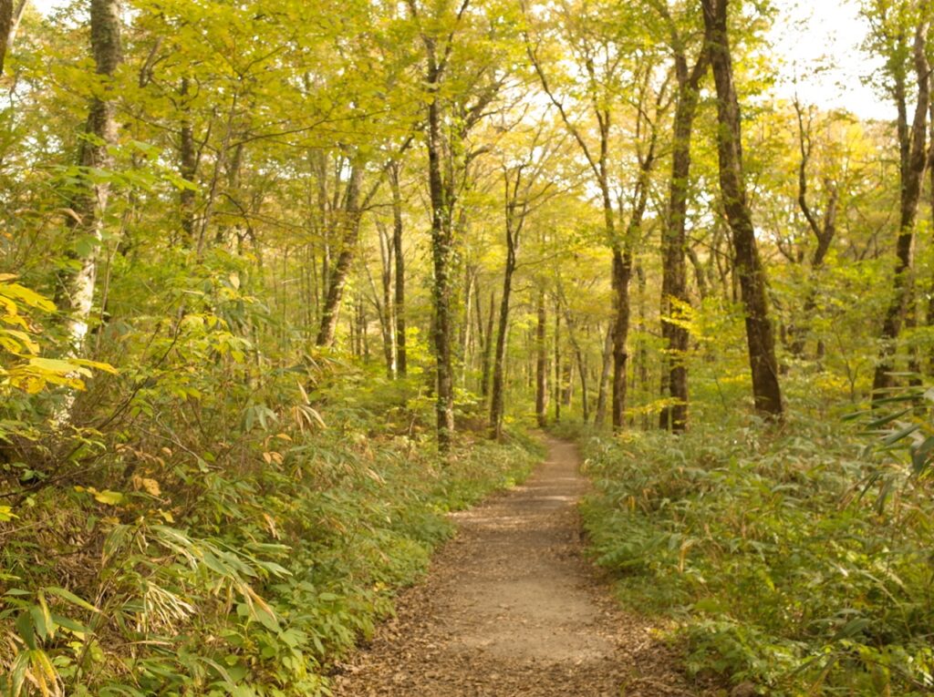 最受歡迎的「十二湖健行路線」除了能看見碧藍色「青池」之外,這條路線平緩好走,沿途還會經過茂密的山毛櫸林,總路程約為1小時左右,就算是登山新手也可以輕鬆完成。每年秋天來臨,白神山地會被染上一片黃色與橘紅色,是青森縣中人氣的賞楓景點之一。