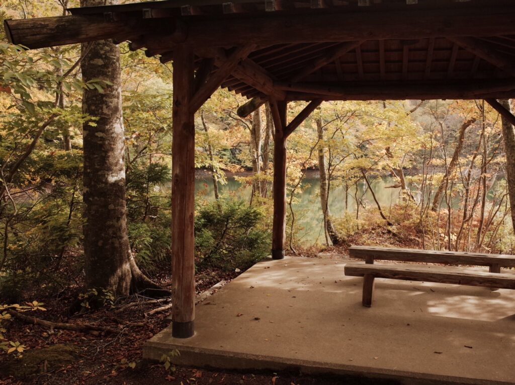 「雞頭場的池(鶏頭場の池)」是健行路線的第一站,靜謐的山中湖搭配周圍漸漸轉紅的樹葉,充滿秋意的景色,真的是浪漫無比,魅力可以說是不輸最有名的青池。這裡設有涼亭,不趕時間的話,不妨坐下來慢慢欣賞這一片風景吧!