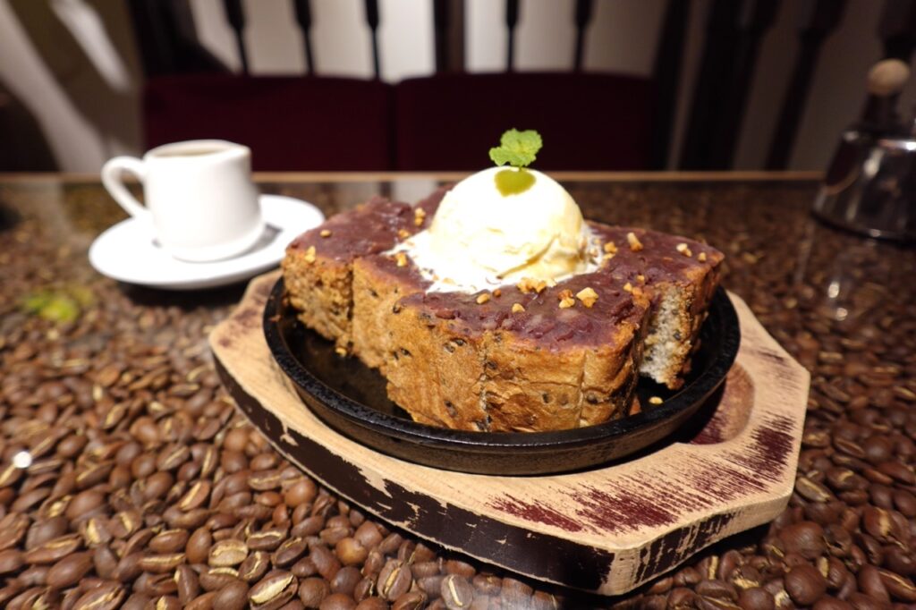 烤得微酥的芝麻吐司,放在熱騰騰的鐵板上,同時吸滿店家特製的咖啡濃縮醬(コーヒーシロップ),再搭配香草冰淇淋和特製紅豆內餡,一起吃下,芝麻、咖啡、紅豆融為一體的香氣,在口中擴散,絕對是來到名古屋不能錯過的經典美味!