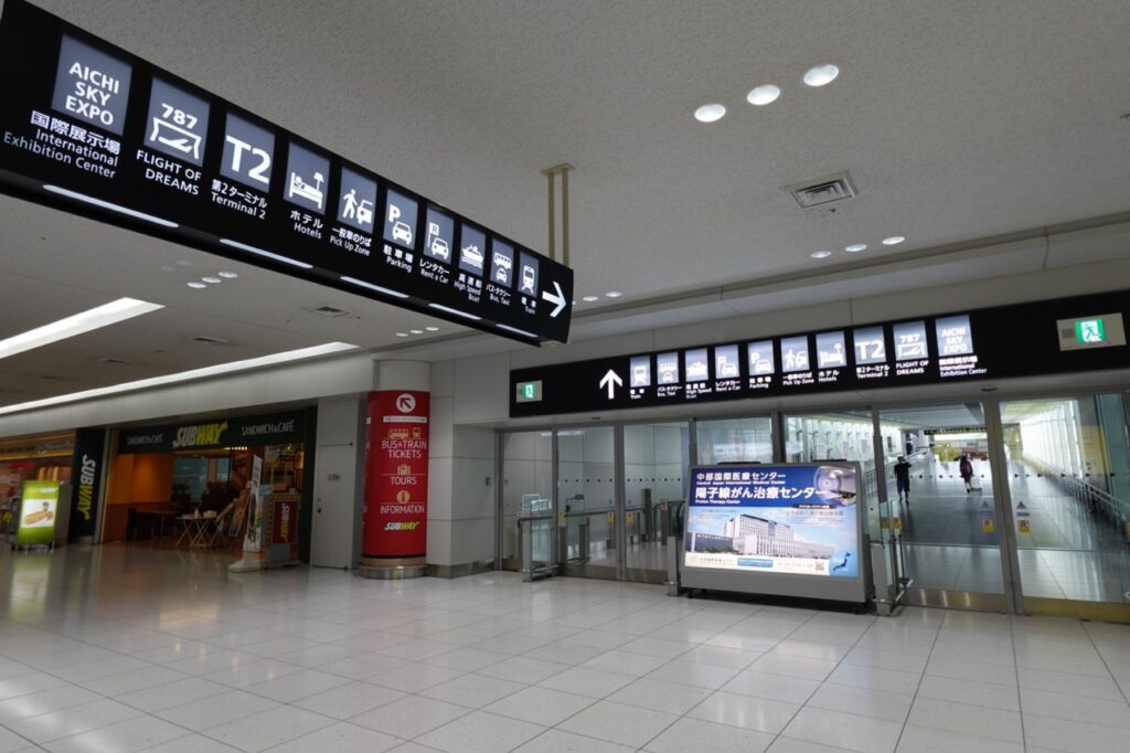 拿完行李後,按照指示抵達入境大廳,就能看到顯眼的交通指南看板,在這裡可以確認名古屋鐵道「μ-SKY(ミュースカイ)」的發車時間,一旁也有詢問處,為抵達名古屋的旅客們提供相關協助。
