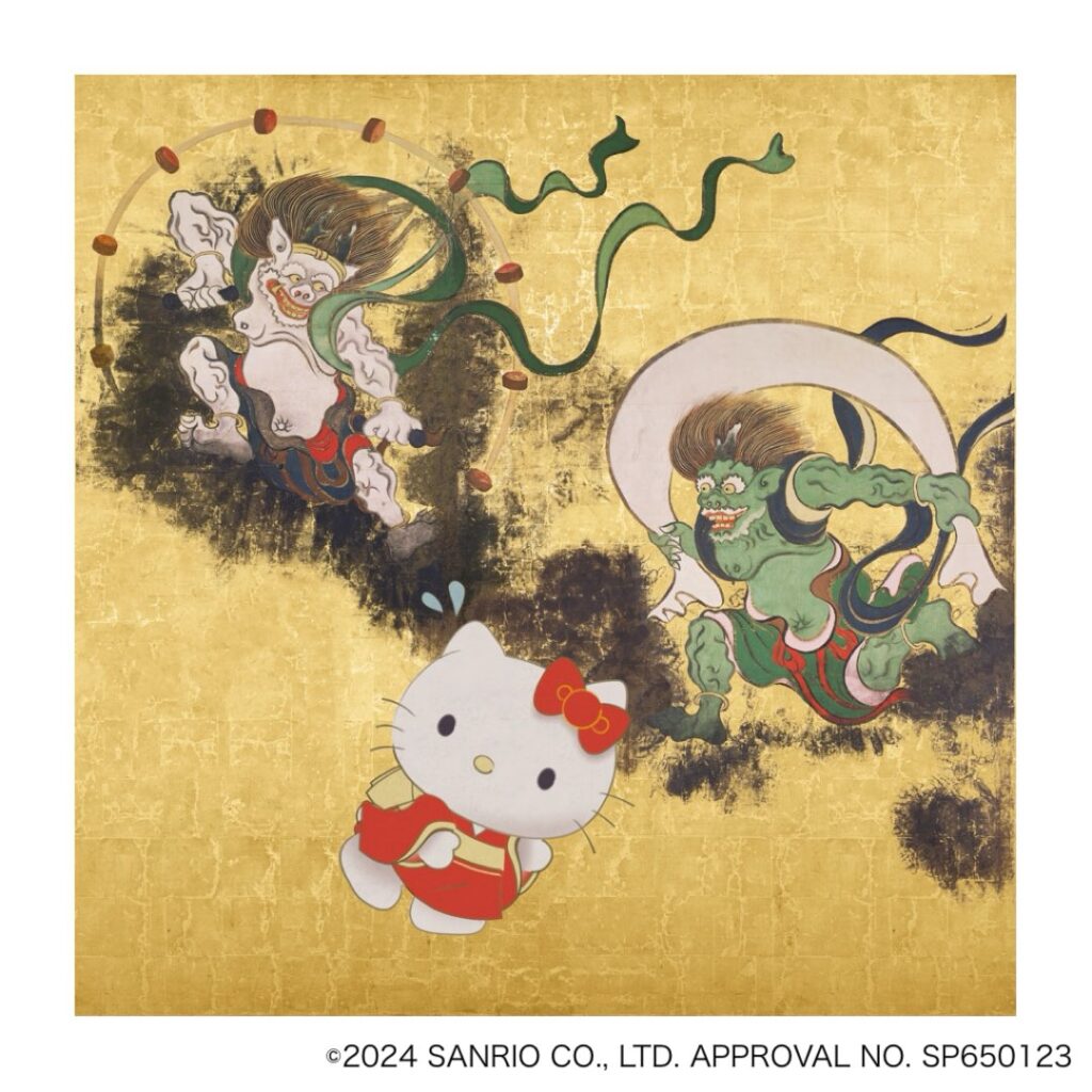 展覽還特別呈現了Hello Kitty與東京國立博物館所藏名作的聯名,如《回首美人圖》及重要文化財《風神雷神圖屏風》。這些作品不僅在展示區中亮相,還有特別設計的聯名甜點與雜貨於在紀念品販售區販售。