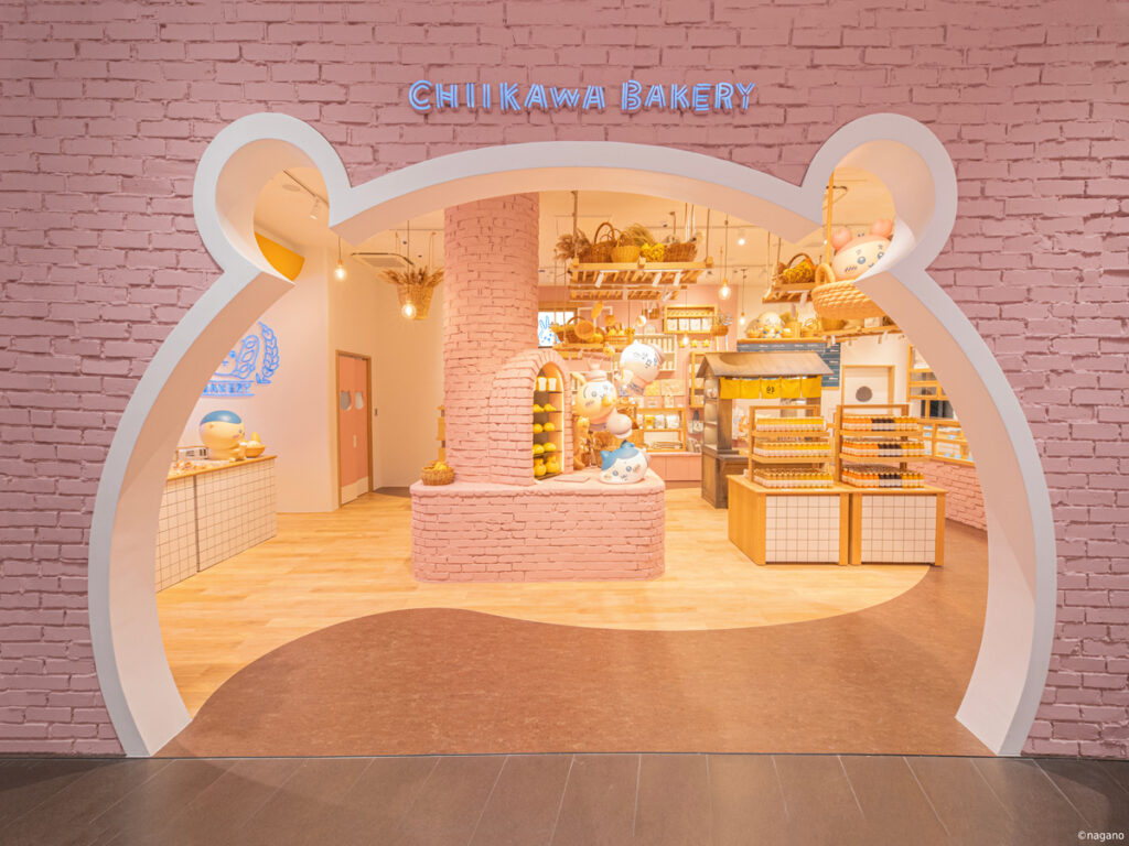 店鋪的圓形拱門入口仔細一看正是「吉伊卡哇」的臉型設計,進入店裡映入眼簾的是以柔和粉色為基調的室內裝潢。特別醒目的粉色長煙囪與爐灶造型裝置前,展示著正在麵包店內忙碌的「吉伊卡哇」、「小八貓」以及「兔兔屋薩奇」的活潑開朗的模樣,營造出溫馨的氛圍。