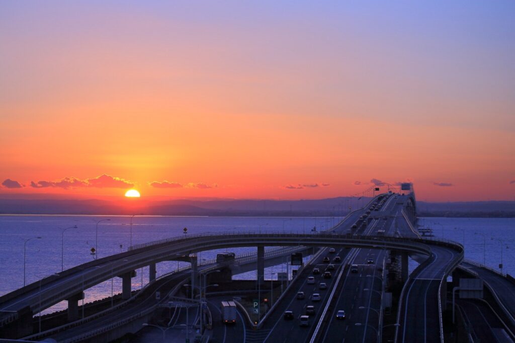 位於千葉縣的「海螢停車區(海ほたる)」,位於東京灣跨海大橋上,提供觀賞日出的極佳視角。這個位於東京灣上的美麗停車區,不僅交通方便,更擁有壯麗的海景。