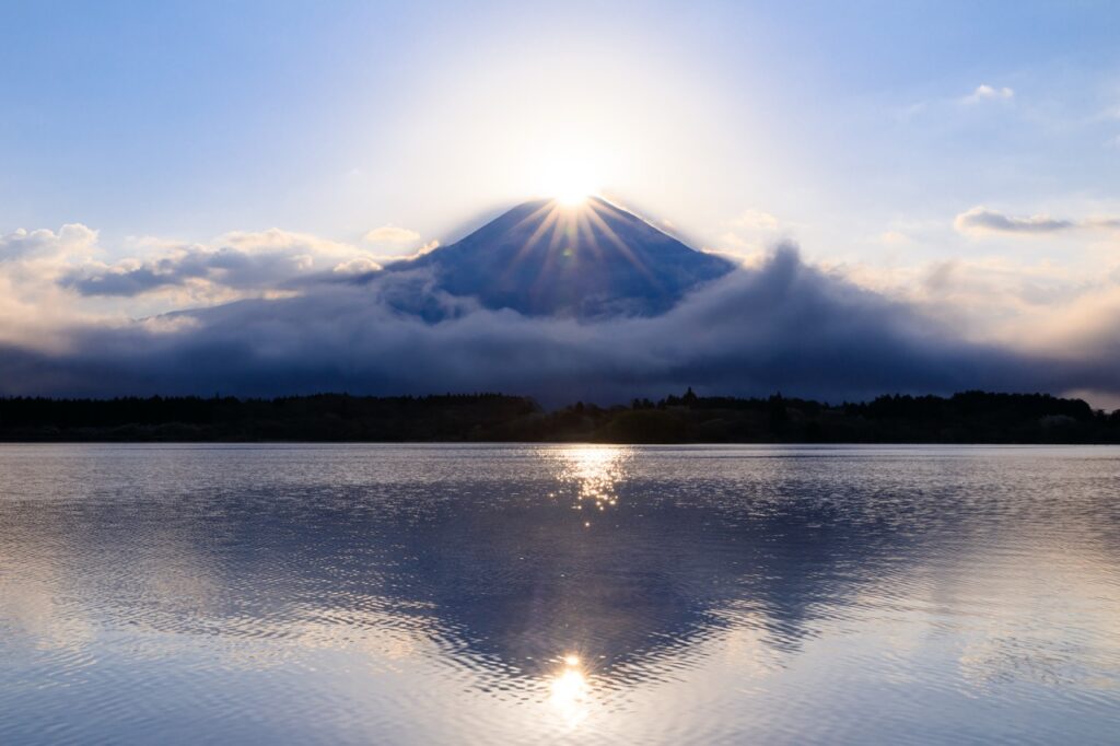 當太陽從富士山頂升起,光芒照耀的瞬間,富士山頂似乎嵌上一顆閃閃發亮的鑽石,這就是著名的「鑽石富士」現象。