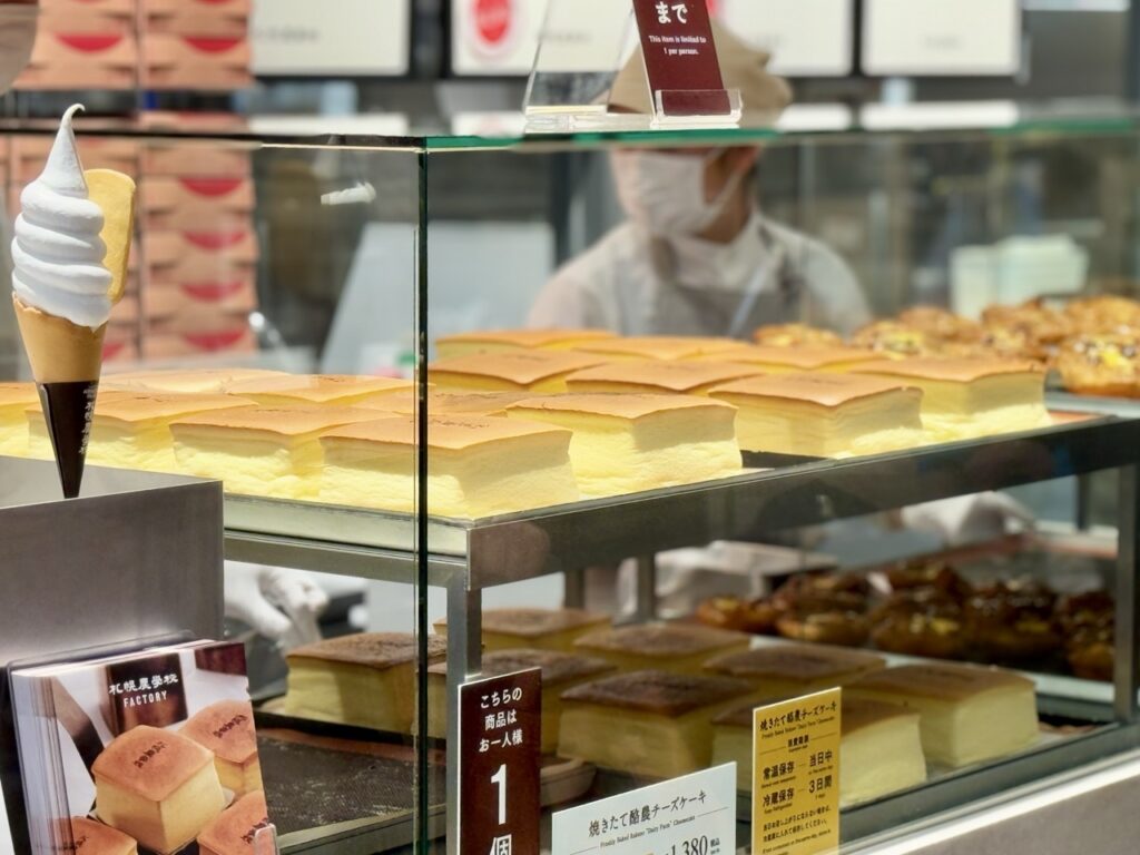 另一個不可錯過的招牌商品「起司蛋糕」,使用北海道優質奶源製作,起司蛋糕非常綿密,帶著濃厚奶香,受眾多旅客極高評價。特別是剛出爐被端上展示櫃內抖動的蛋糕體,讓人特別讓人想要挖一口來吃!