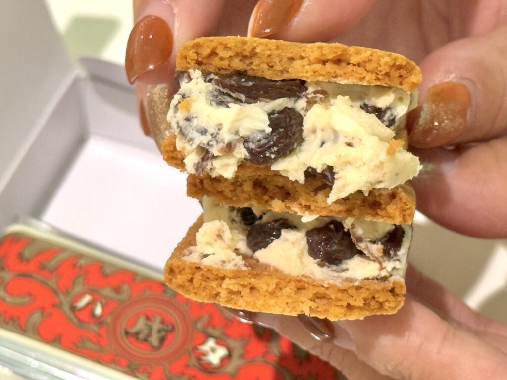 這款餅乾採用萊姆酒醃漬的葡萄乾,搭配由北海道生乳製成的奶油內餡,夾在兩片酥脆餅乾之間,形成濃郁又帶有微酸酒香的獨特風味。