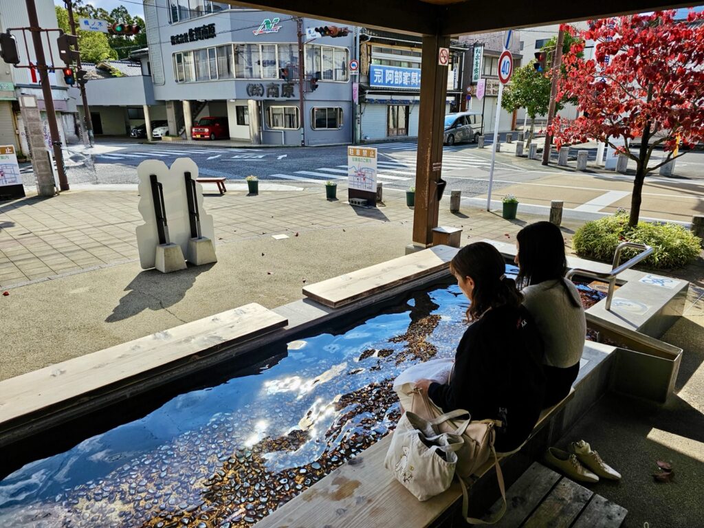 來到湯宿廣場的這一天,恰好與幾個韓國年輕人坐在一起,其中一個曾在廣島留學,日文說得很好,其他幾位則跟著他來旅行。我們一邊泡足湯一邊聊天,交換旅行的經驗。突然意識到,說著日文的我們,彼此都是異鄉人,因為日本的好山好水,讓不同國度的人學習起當地的語言,於是才有了一個如此特別的午後時光,在暖暖的溫泉中,一期一會。