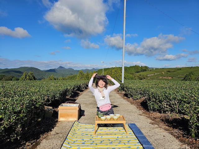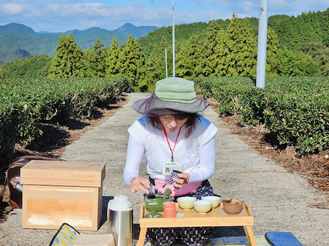 眾人參觀茶園,聆聽永尾智子為大家解說種茶的過程,並理解嬉野茶的特色以後,她拿出了野餐墊,鋪在茶畑中間,邀請大家席地而坐。接著,就見她搬出一整套的沖茶器具,擺好陣仗,開始沖茶。在茶園裡喝茶的經驗是有的,不過,像是野餐一樣,直接坐在綠油油的茶畑裡,頂著晴空,迎著山裡的微風,邊喝邊聊天,這經驗迄今倒是絕無僅有。