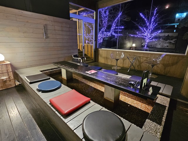 旅館內設有足湯沙龍咖啡區,晚餐後,不妨來此一邊浸泡足湯,一邊享用飲品。足湯區面向嬉野川,景色怡人,若恰好遇上點燈時節,氣氛相當浪漫。至於春季,更可欣賞櫻花盛開的絕佳氛圍。