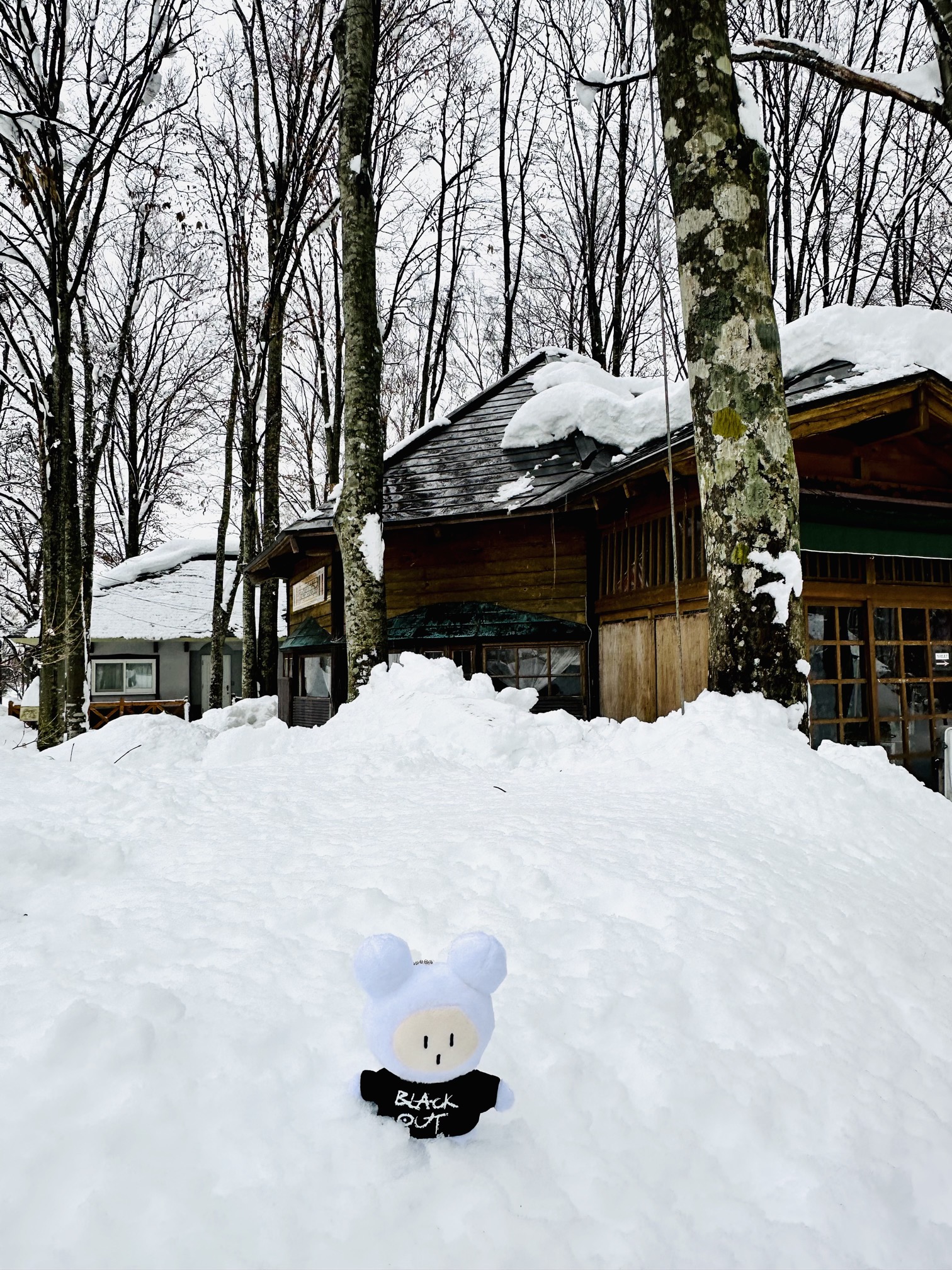 雪地不好走,風漸漸大,雪已不是用飄的,而是直擊臉龐。現在不用特地去鏟雪當刨冰了,只要一張開嘴,冰就入口,「食べ放題」吃到飽。好不容易抵達咖啡店,結果,在大雪包圍的中央,那間網路上顯示有開的店,果然沒開。店沒開,卻一點也不掃興致。因為周圍的雪景實在太美,我們忙著開始互相拍照,而且不只拍人,還拿出帶著的玩偶,替它們擺拍寫真集。