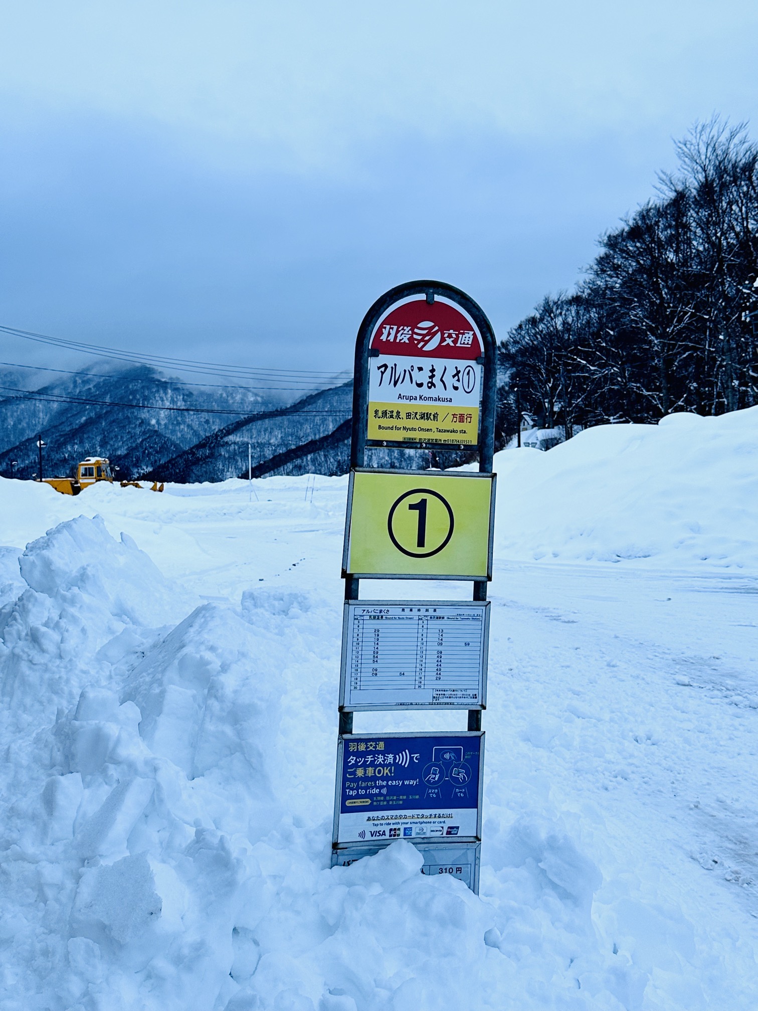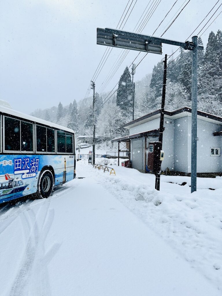 從飯店回田澤湖車站,跟來的時候一樣得搭巴士。飯店櫃檯人員告訴我們巴士的時刻表,我們用完豐盛的早餐後,回到暖暖的房間待機,等到時間到了才拖著行李,走過積雪,尋找「據說」在斜對面的巴士站牌。
