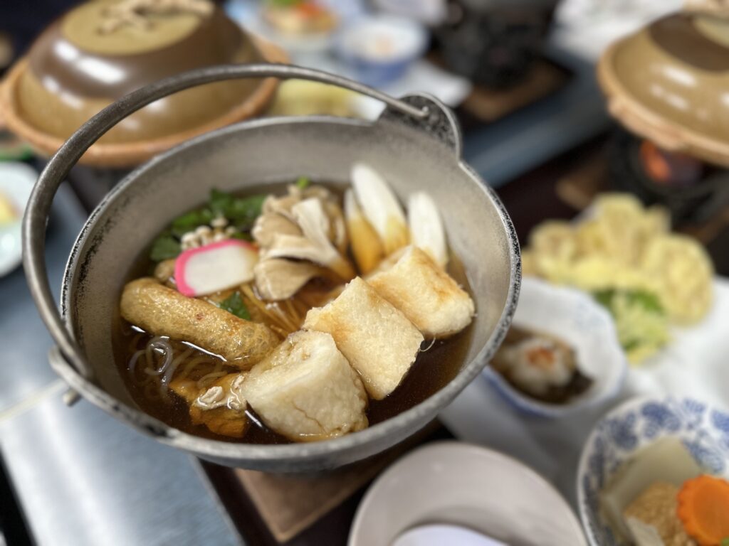 轉乘巴士搭車去溫泉旅館前,先在站前的食堂用午餐。這附近清一色賣的都是秋田名產「稻庭烏龍麵」,我們挑離車站最近的這家「MIZUUMI」(みずうみ),並點了有加入秋田名物「切蒲英」(きりたんぼ)的烏龍麵來吃。