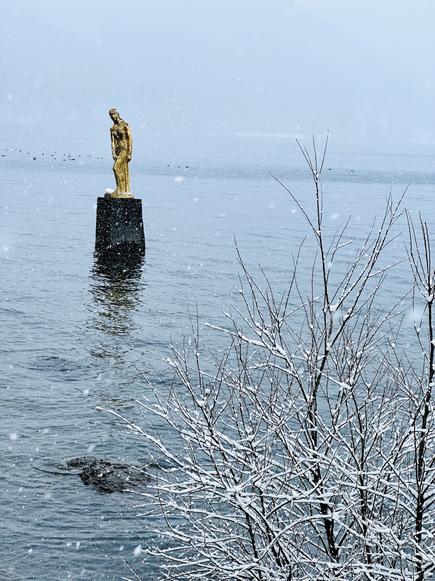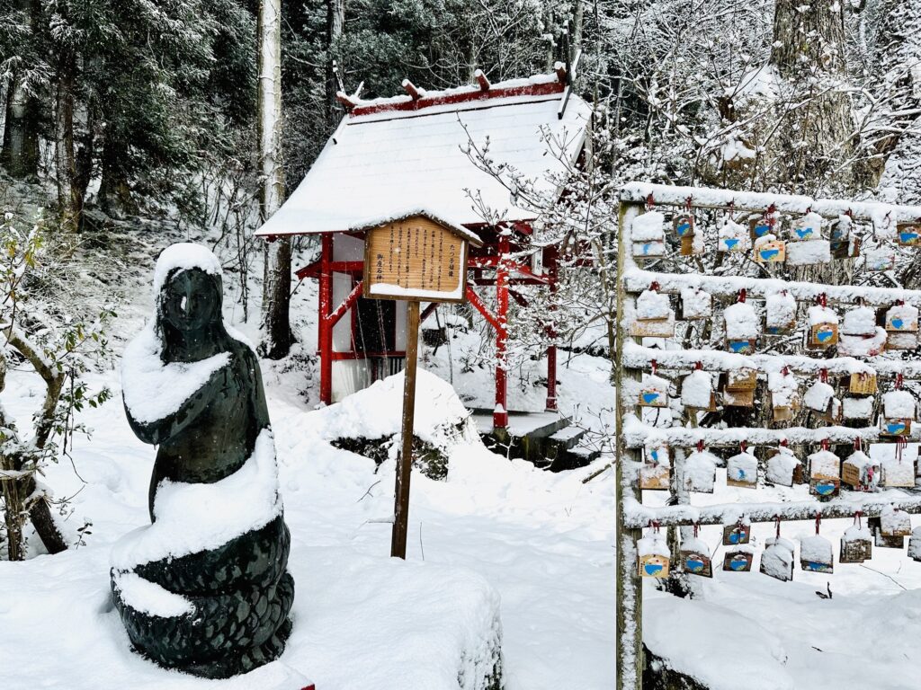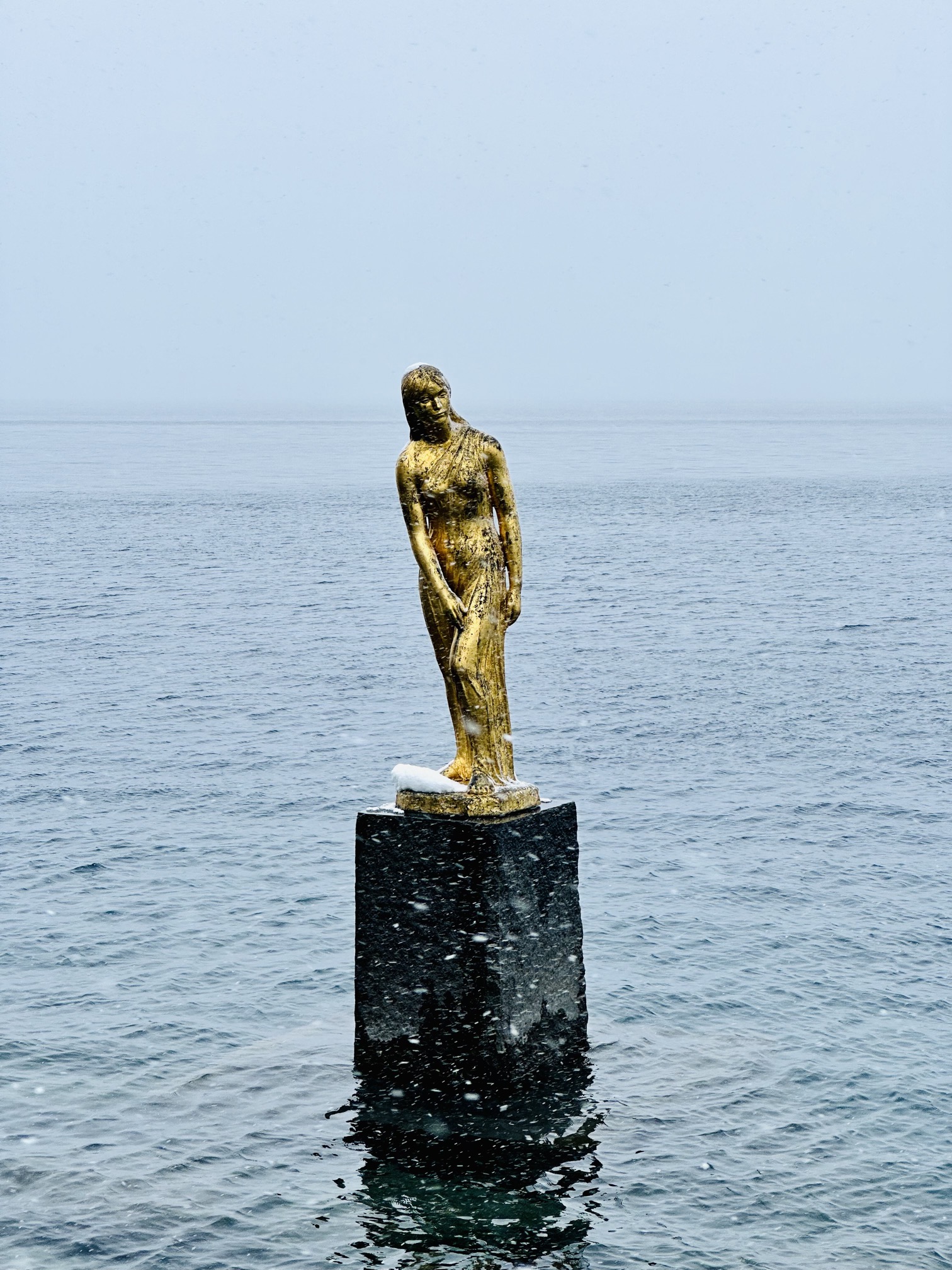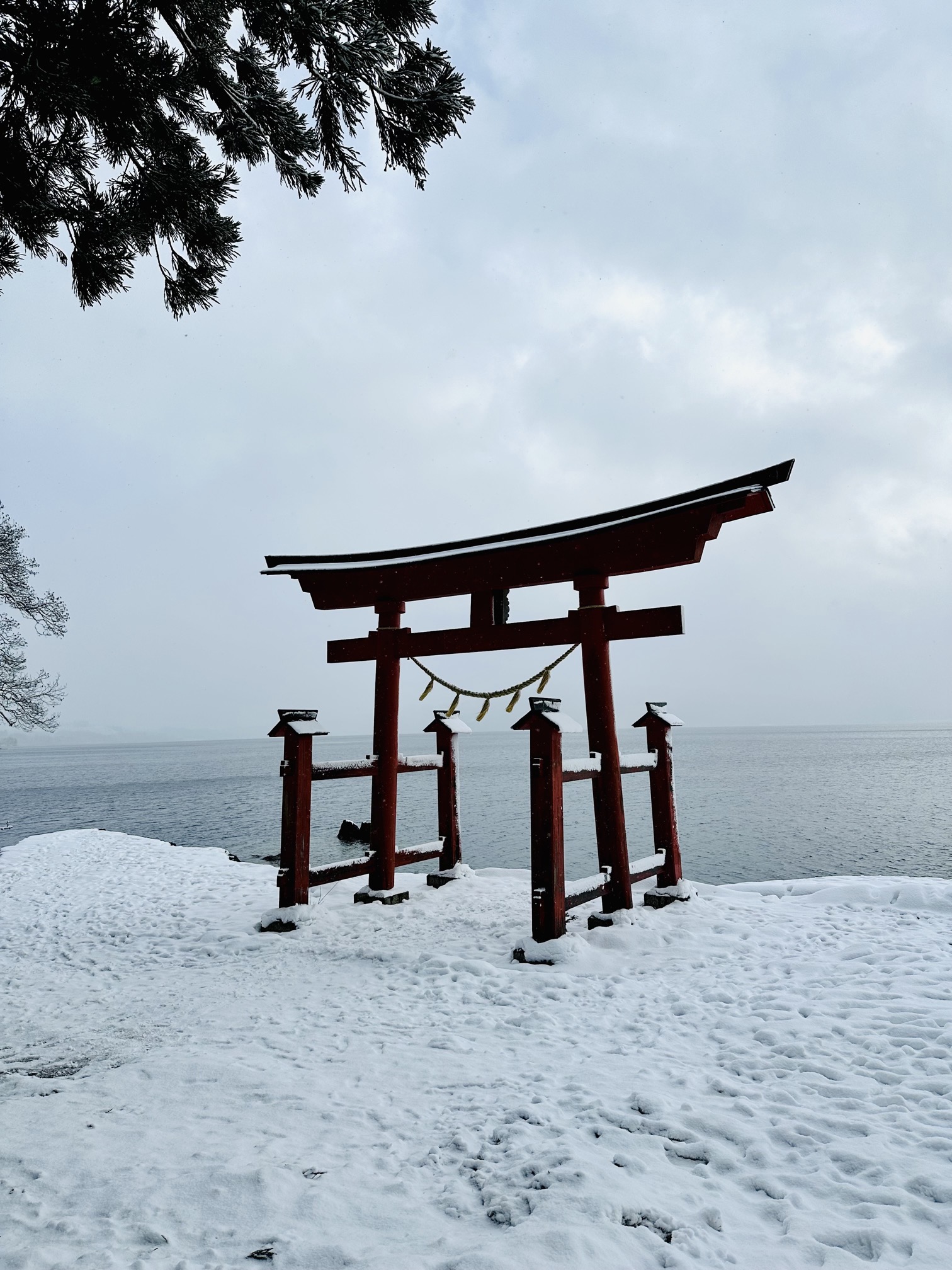 田澤湖是日本最深的湖,前一回到訪田澤湖是夏天,這一次是隆冬,景致截然不同。夏天景色開闊,綠意盎然,充滿朝氣;冬天大雪紛飛,寒冬的辰子像和一旁的浮木神社,配上周圍盡是沾雪的枯枝,很有禪意。
