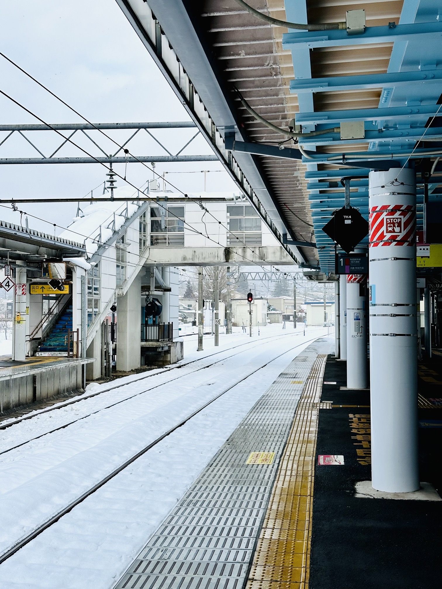 站在月台上等車的我們又忍不住開始擺拍起來。反正有雪、有鐵道、有冬衣,就值得好好拍。