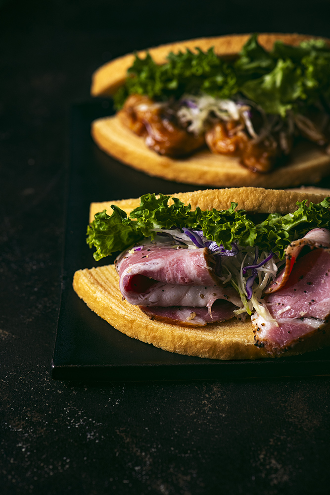 以特製低甜度的年輪蛋糕夾入煙燻牛肉與加入涼拌風味的蔬菜,簡單美味的單手輕食。