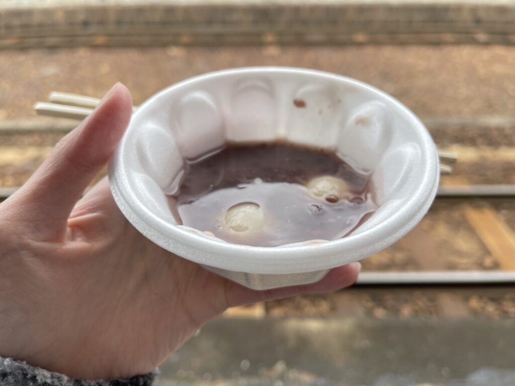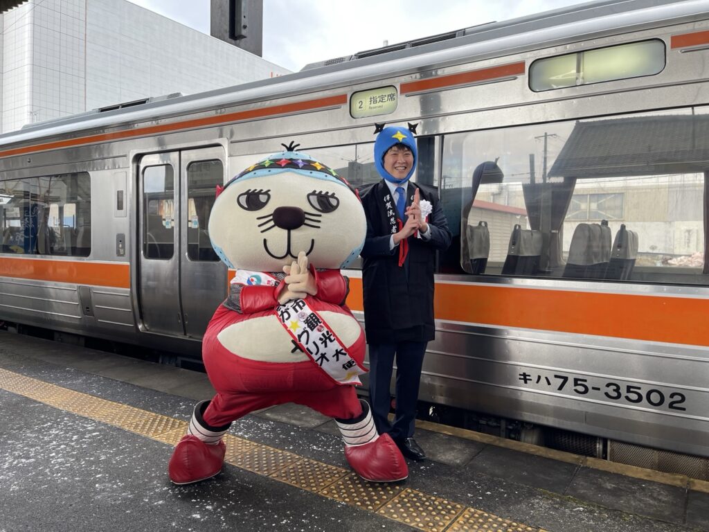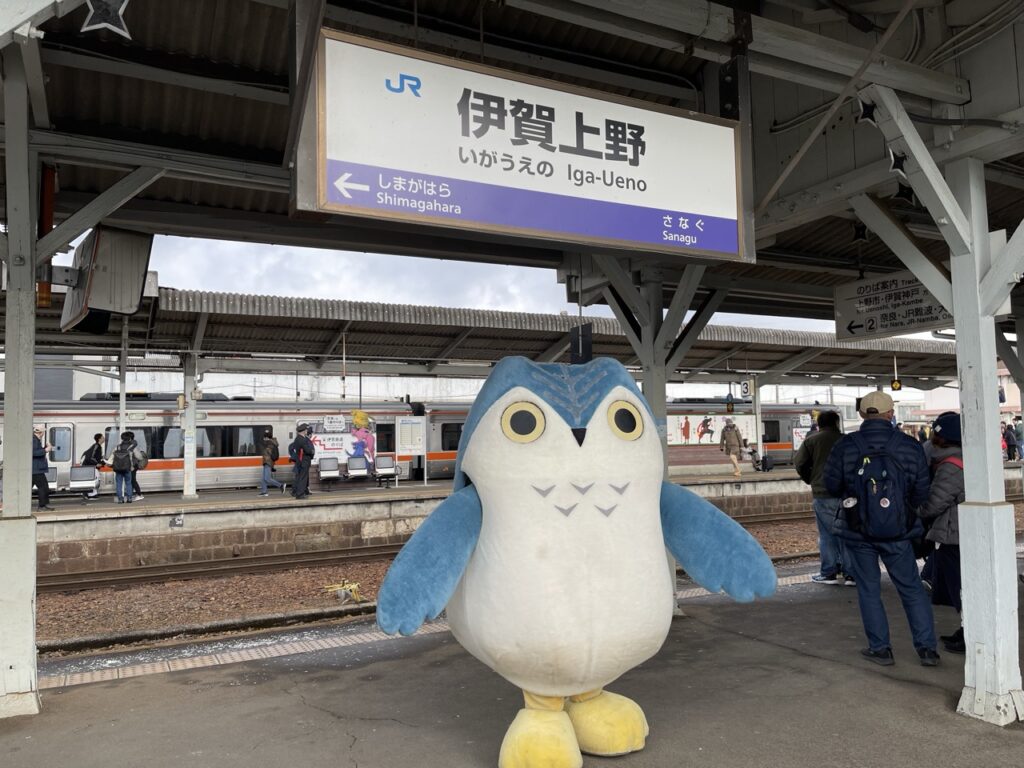 抵達伊賀上野站後,不僅有熱情的當地居民準備溫暖的白玉紅豆湯,給各位旅人享用,伊賀鐵道的吉祥物「ふくにん」,以及伊賀市觀光大使「いが☆グリオ」,不僅活潑地迎接每位來訪旅人,還與大家親切互動拍照,讓現場的大家都不禁開心大笑。