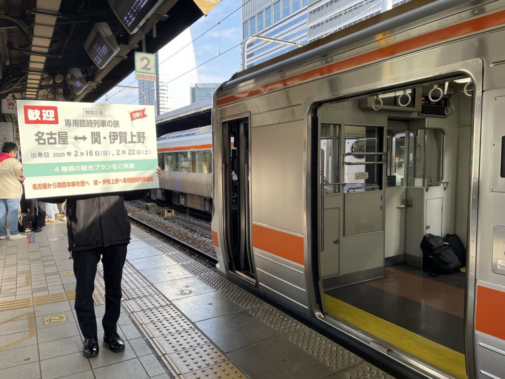 這次搭乘的「JR 東海 KiHa 75 型柴聯車(JR東海キハ75形気動車)」是為了推廣關西本線及沿線觀光而特別運行的臨時列車,僅在 2025 年 2 月 16 日和 22 日兩天限定運行。這趟列車不僅是 18 年來首次實現名古屋至伊賀上野的直通運行,更是結合文化與旅遊的創新嘗試。